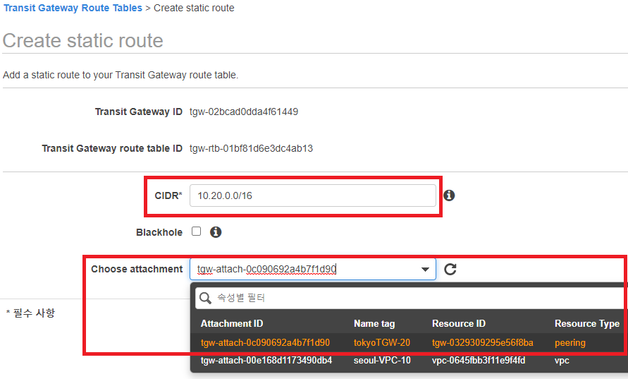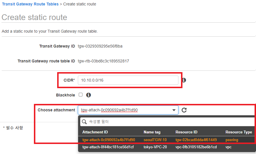 상대 리전 VPC의 CIDR와 TGW Attach를 선택해준다