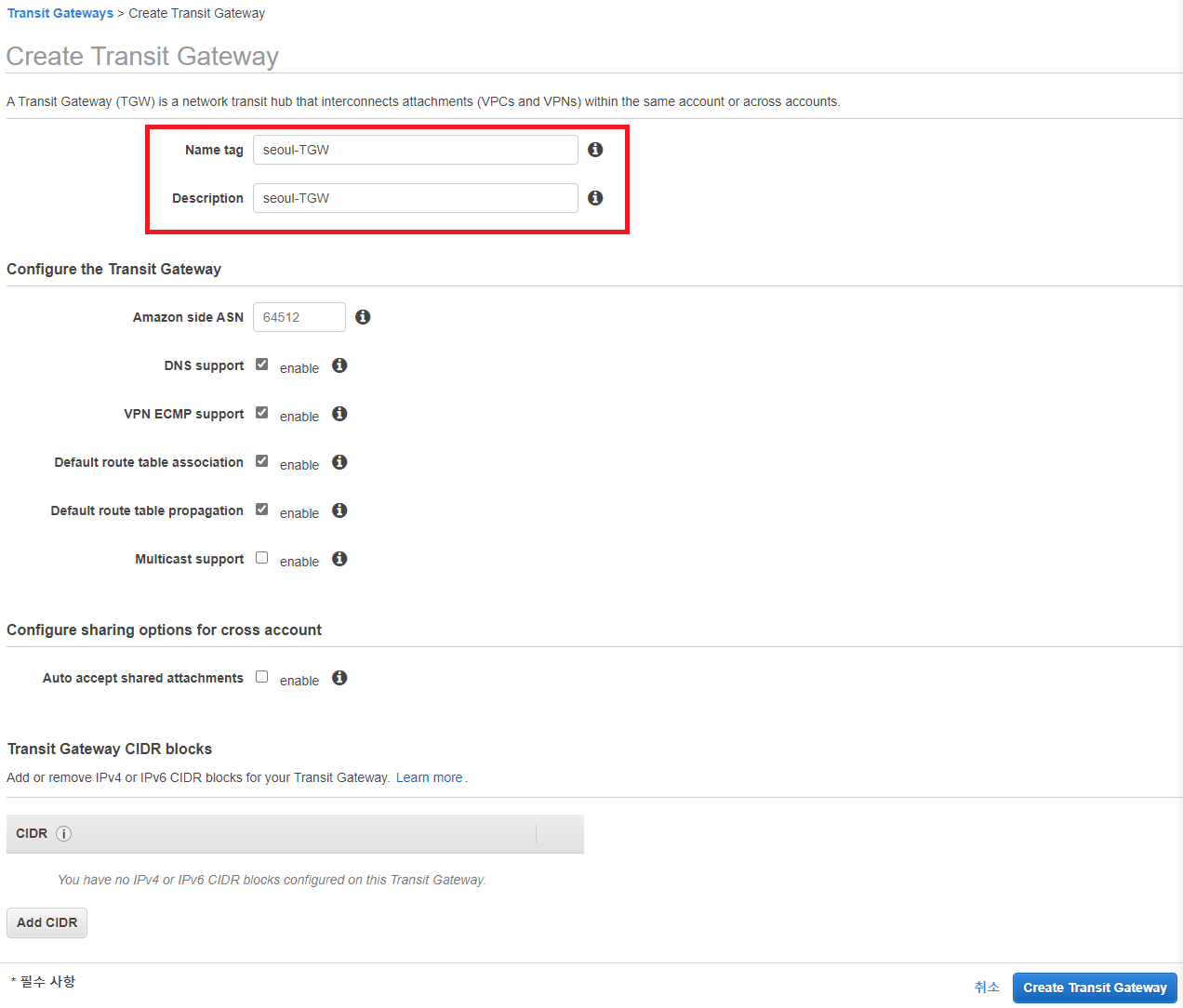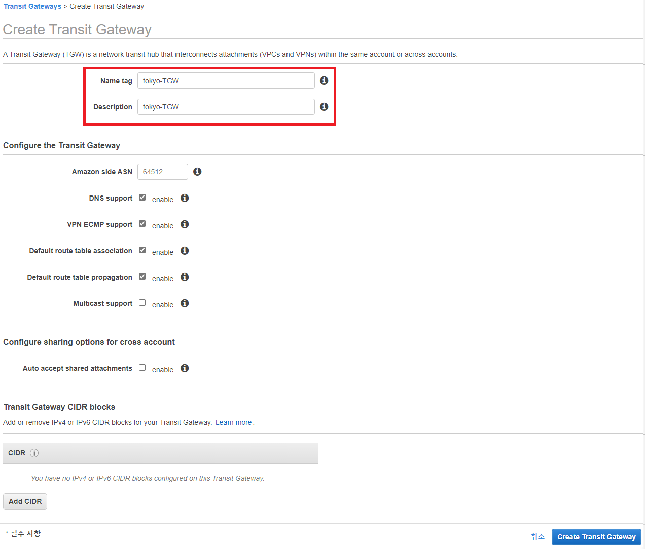 콘솔 > VPC > Transit Gateway > Create Transit Gateway
