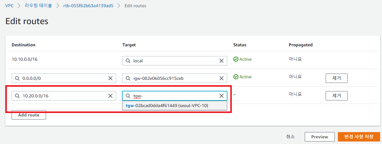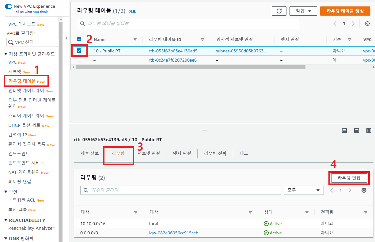 콘솔 > VPC > 라우팅 테이블 > Public RT 선택 > 라우팅 탭 > 라우팅 편집
