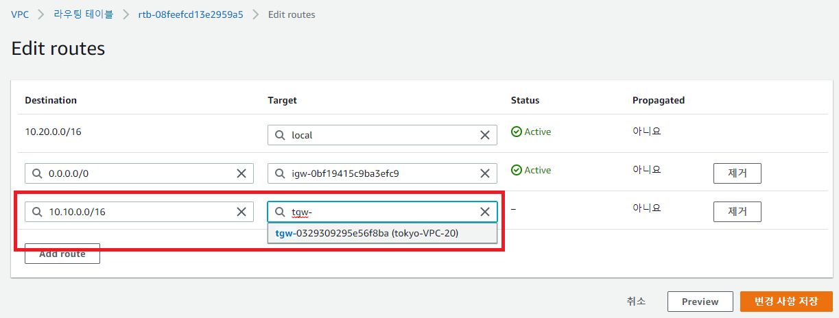 상대방 리전 VPC의 CIDR와 트래픽을 보낼 TGW를 선택해준다