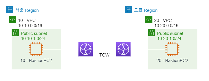 (서울 - 10.10.0.0/16 대역, 도쿄 - 10.20.0.0/16 대역 사용)