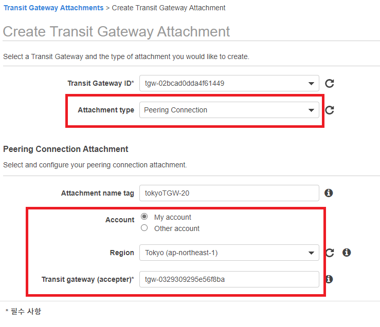 중요한건 Attachment type을 Peering Connection 으로 바꿔주고 연결될 Region을 설정한 후, 해당 TGW ID를 직접 입력해줘야한다