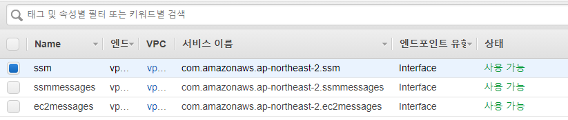 그리고 똑같은 방식으로 com.amazonaws.<region>.ssmmessages, com.amazonaws.<region>.ec2messages 엔드포인트도 생성해준다