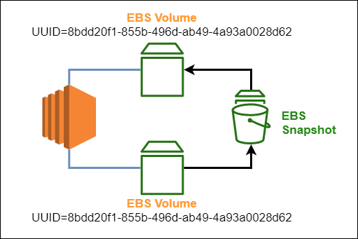 이 때 UUID는 네트워크 상에서 고유성을 보장하기 위한 범용고유식별자인데, 이미 UUID가 생성된 볼륨을 스냅샷을 뜨게 되면 해당 UUID 또한 그대로 가져가게 된다 (아래 그림 참조)