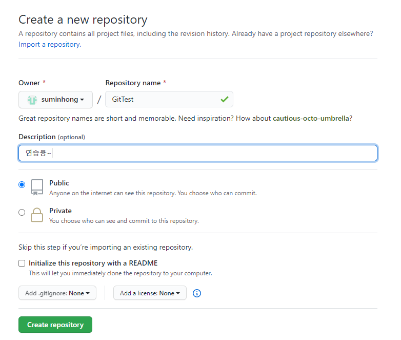 일단 github에서 New를 눌러서 레포지토리(원격저장소)를 하나 새로 만든다
