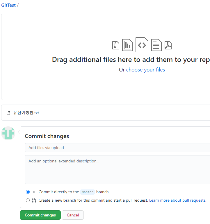 파일을 하나 옮겨놓고 commit changes를 누른다