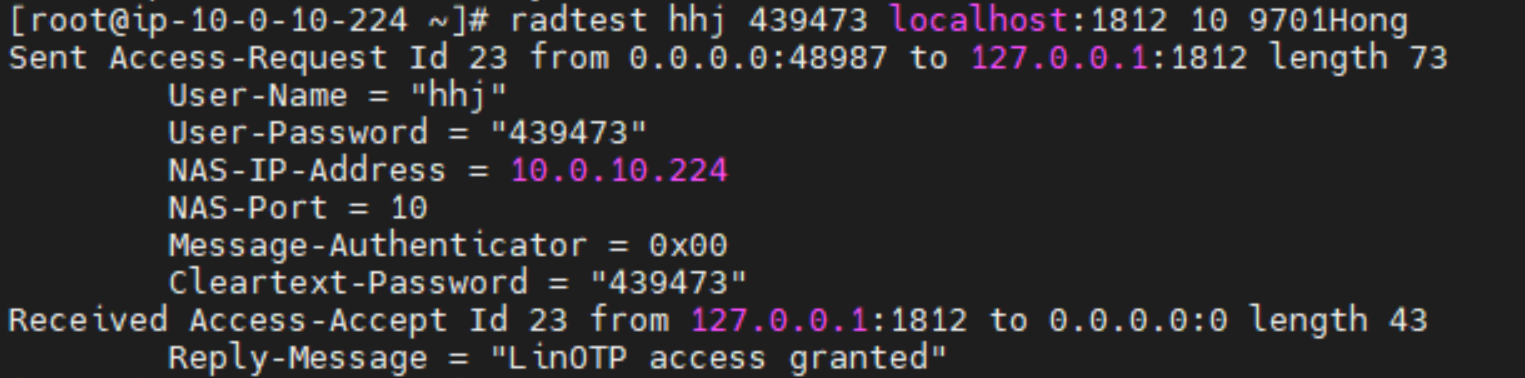 radtest USERNAME MFACODE PRIVATERADIUSIP:1812 10 비밀번호