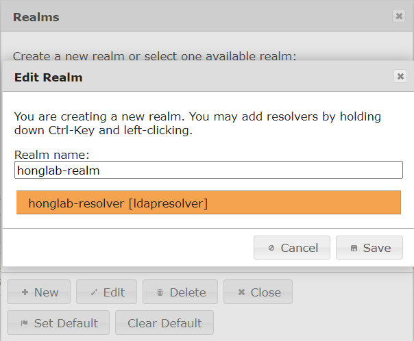 +New 를 누른 후 Realm 이름을 정하고 resolver를 선택해준 후 Save를 눌러주자