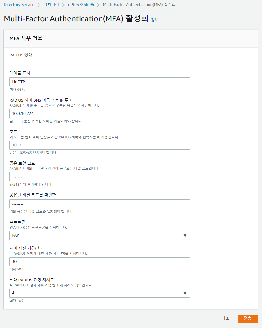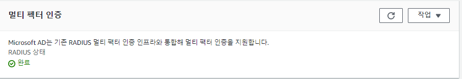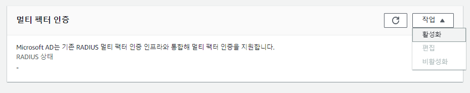 AWS Console > Directory Service > MFA 설정할 디렉터리 > 맨 밑의 멀티 팩터 인증 활성화