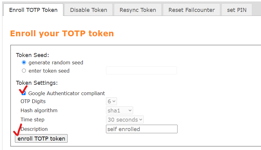 Google Authenticator compliant 를 체크해준 후, enroll TOTP token 을 눌러 토큰을 발급받자