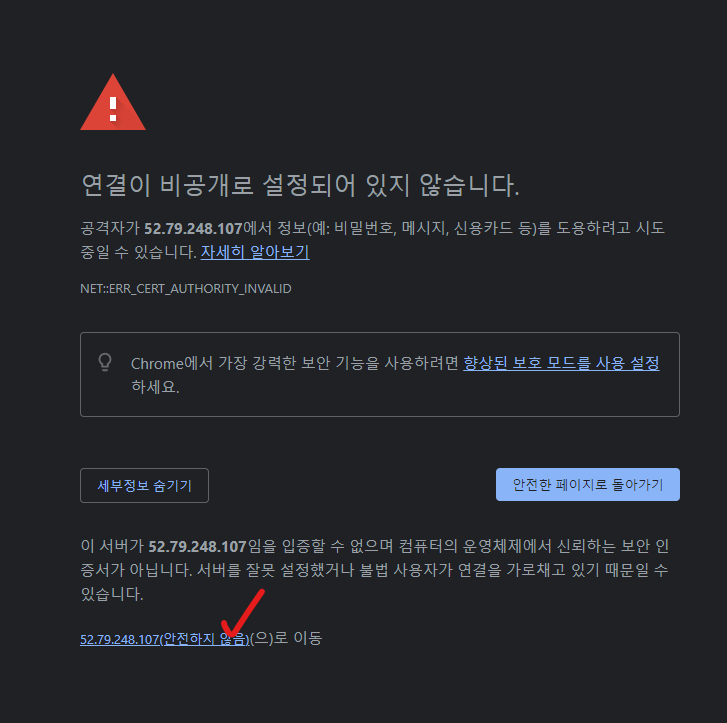 에러 창이 뜨는 것 같지만 그냥 고급 > 안전하지 않음으로 이동 을 눌러주자