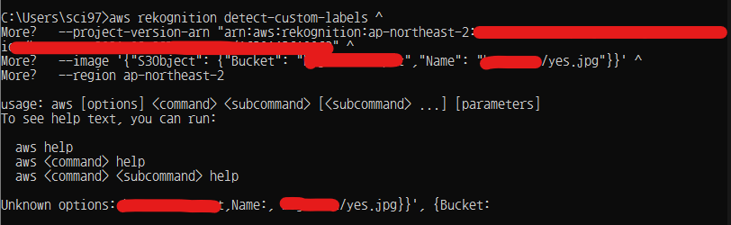 Rekognition Custom Label Model 돌리는데 콘솔에 적힌대로 명령을 내려도 Unkwon options라며 실행이 안됨