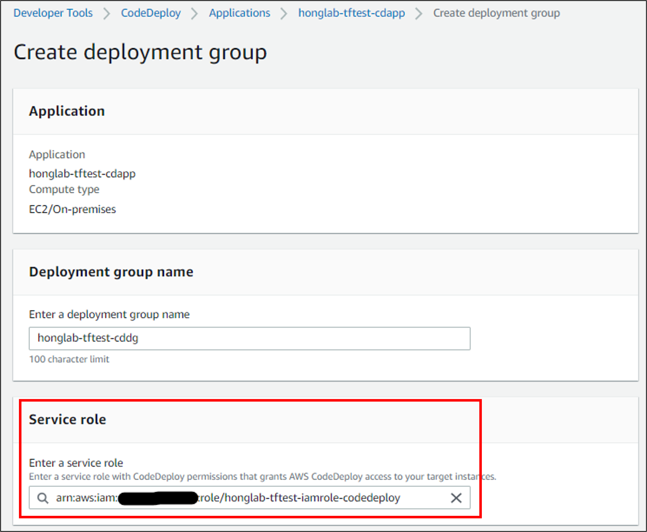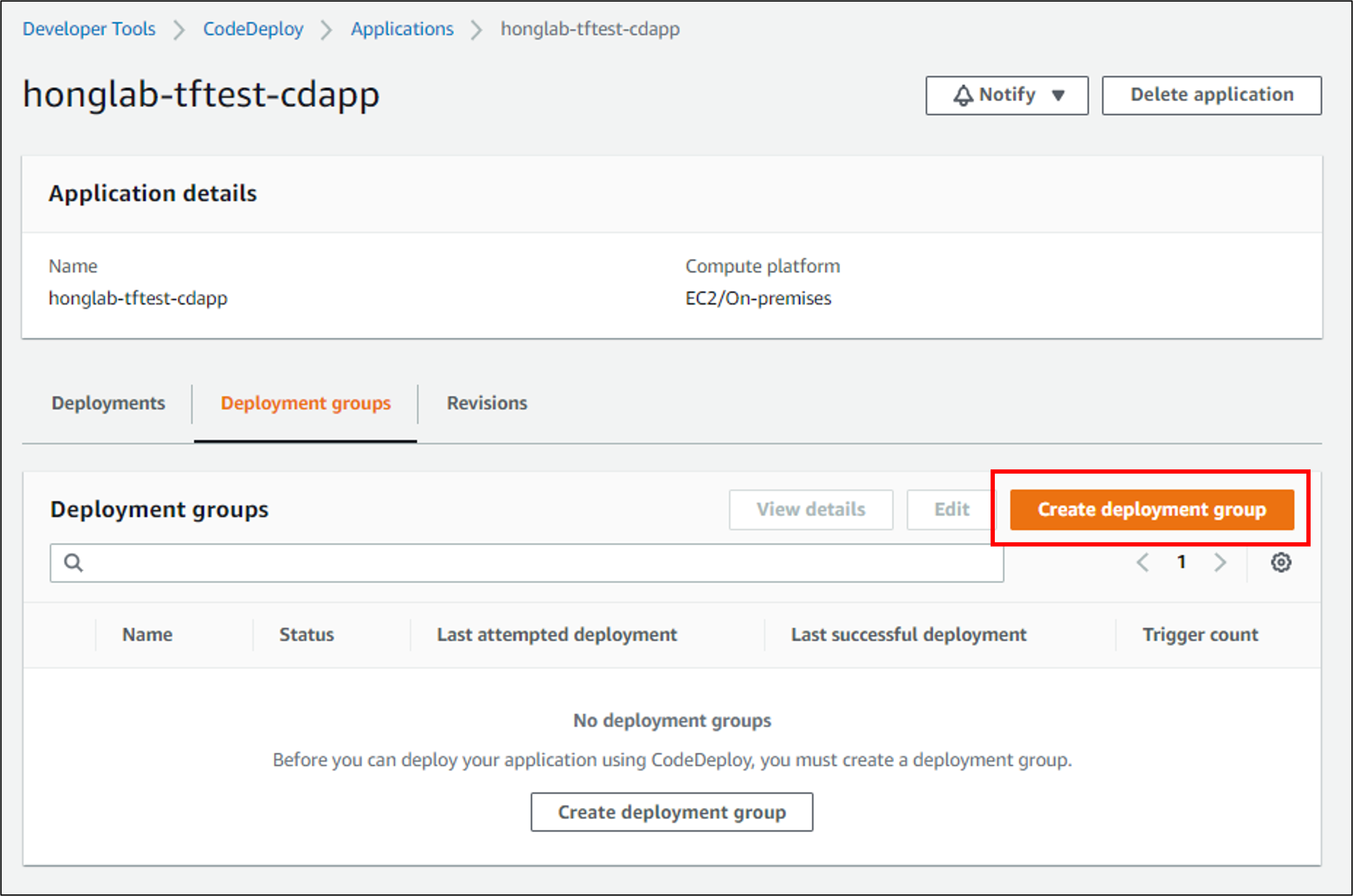 자동으로 해당 application 화면의 Deployment group 탭이 보일텐데, Create deployment group을 눌러주자