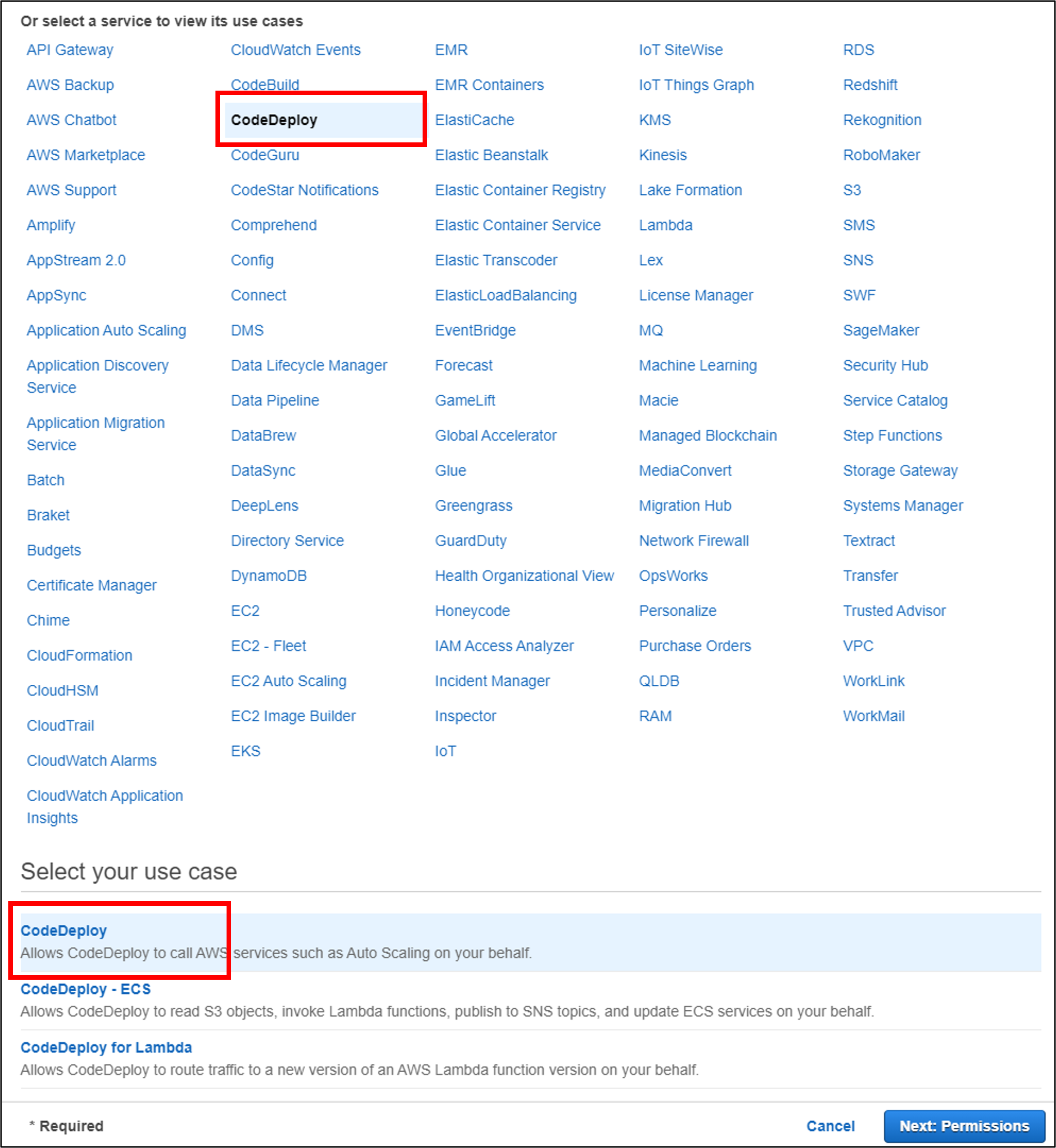 use case를 고를 때 CodeDeploy > CodeDeploy만 눌러준 후 쭉 Next를 눌러주면 된다
