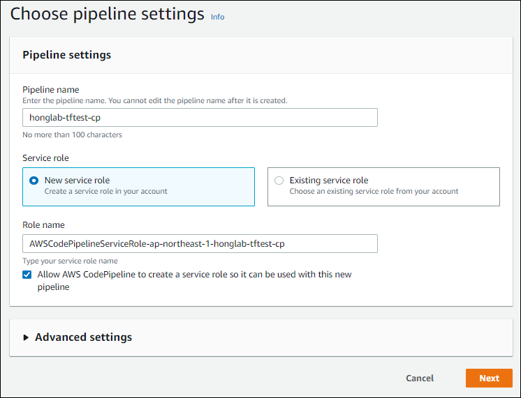 AWS Console > CodePipeline > Pipelines > Create pipeline