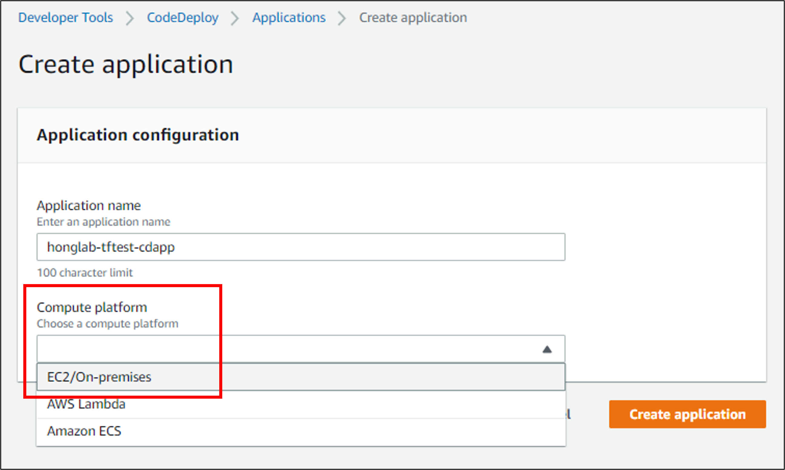 AWS Console > CodeDeploy > Applications > Create application