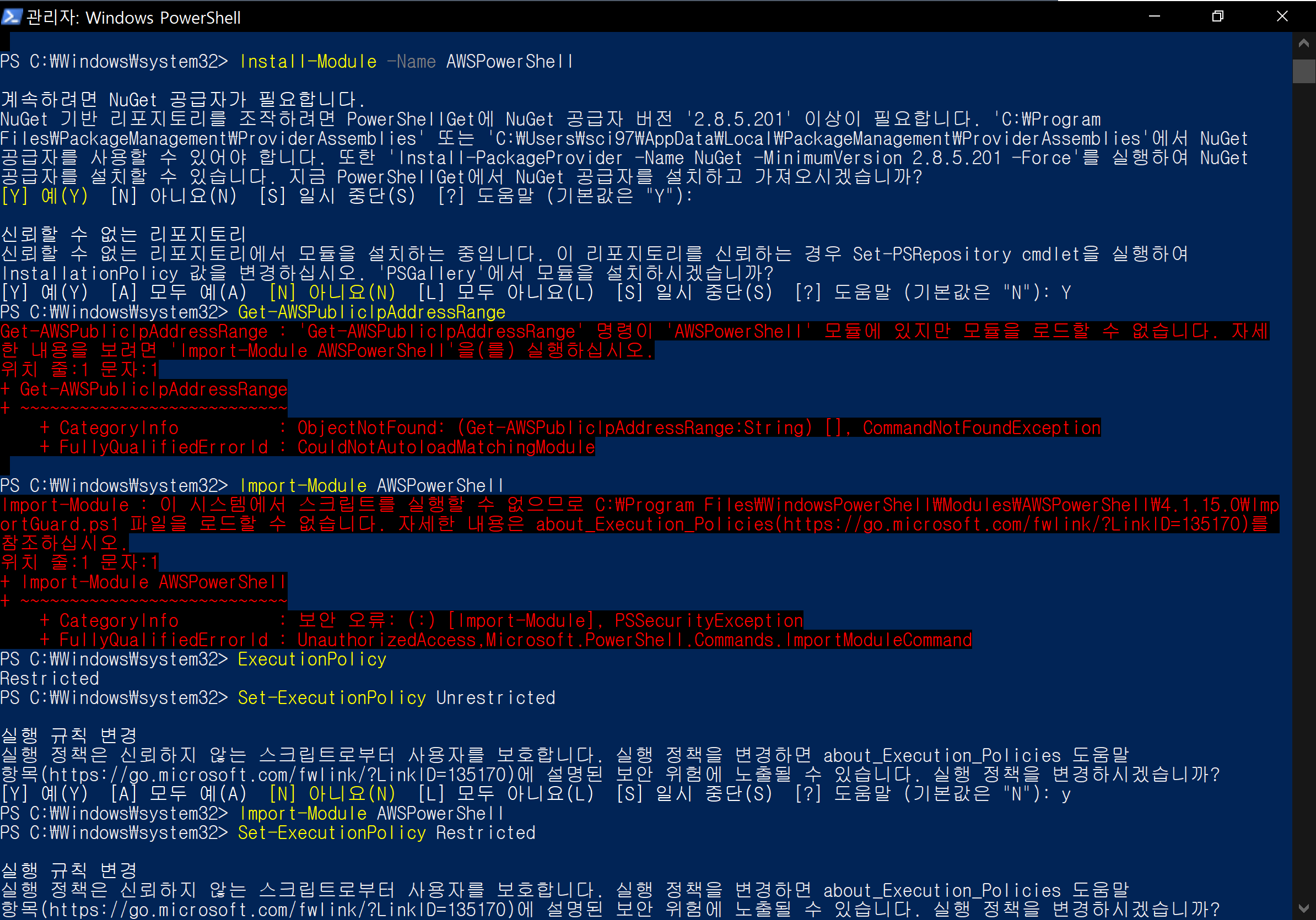 ExcutionPolicy를 Unrestricted 상태로 바꿔야지만 Module을 Import할 수 있었다