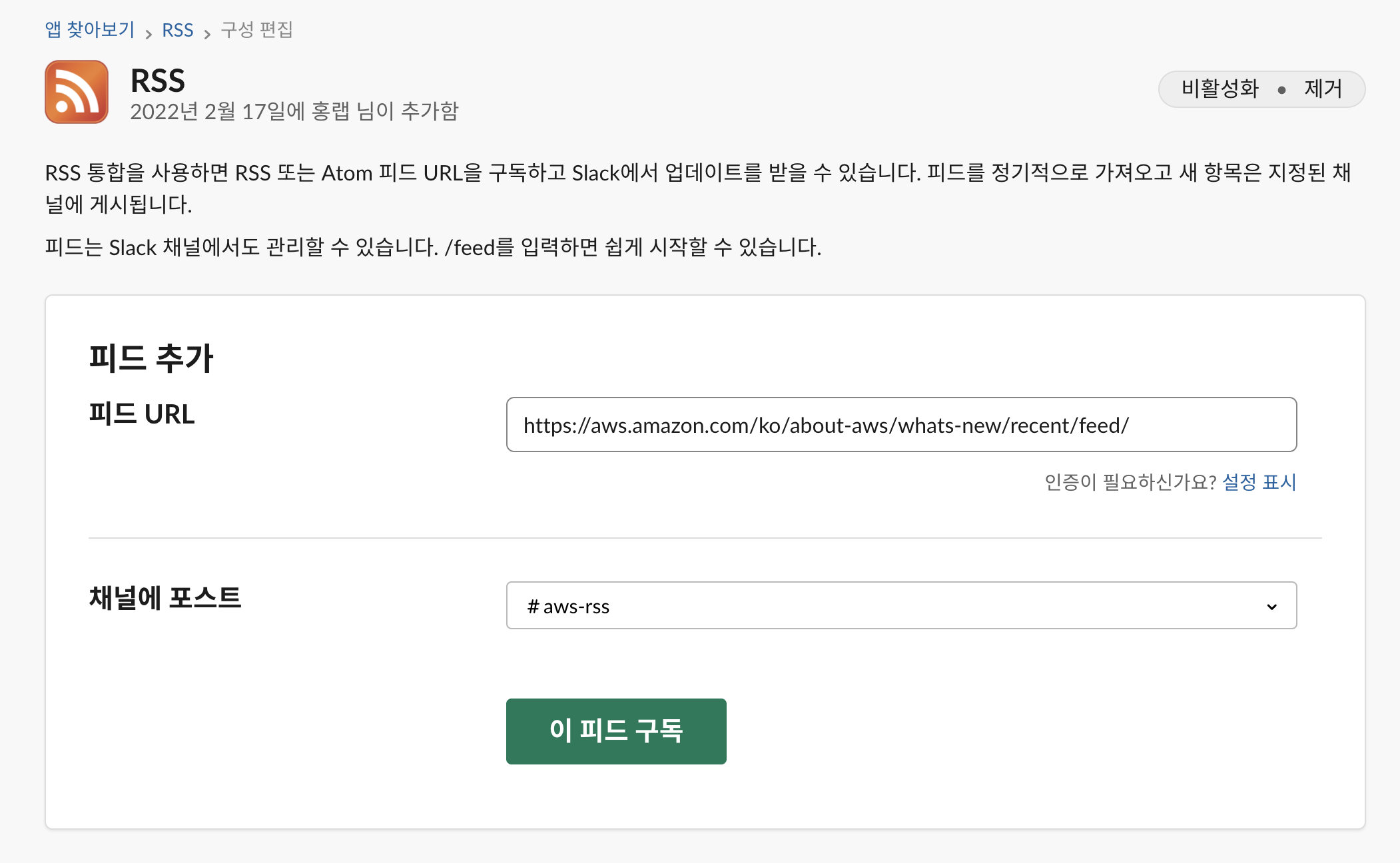 앱이 추가되었다. 피드 URL과 포스트할 채널을 정해주기만 하면 끝이다. (나는 aws-rss라는 채널을 미리 만들어놨다)