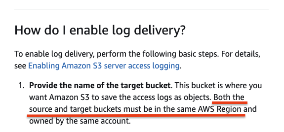 따라서 계정 내 버킷의 리전 종류가 여러개라면, 각 리전별로 액세스로그용 버킷을 만들어야 한다