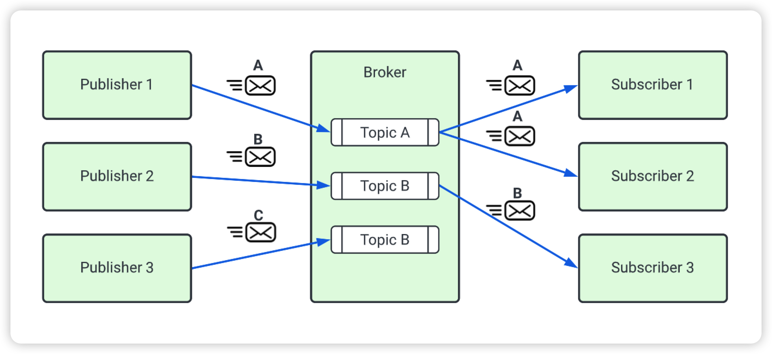 - Subscriber는 여러 Topic 중 하나를 선택하여 메시지를 받음