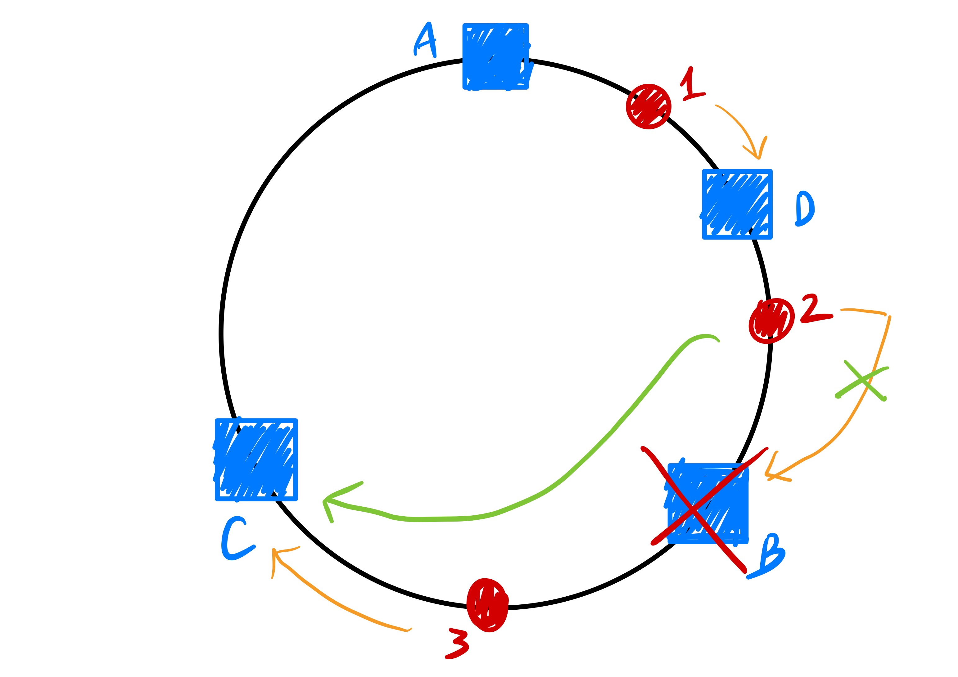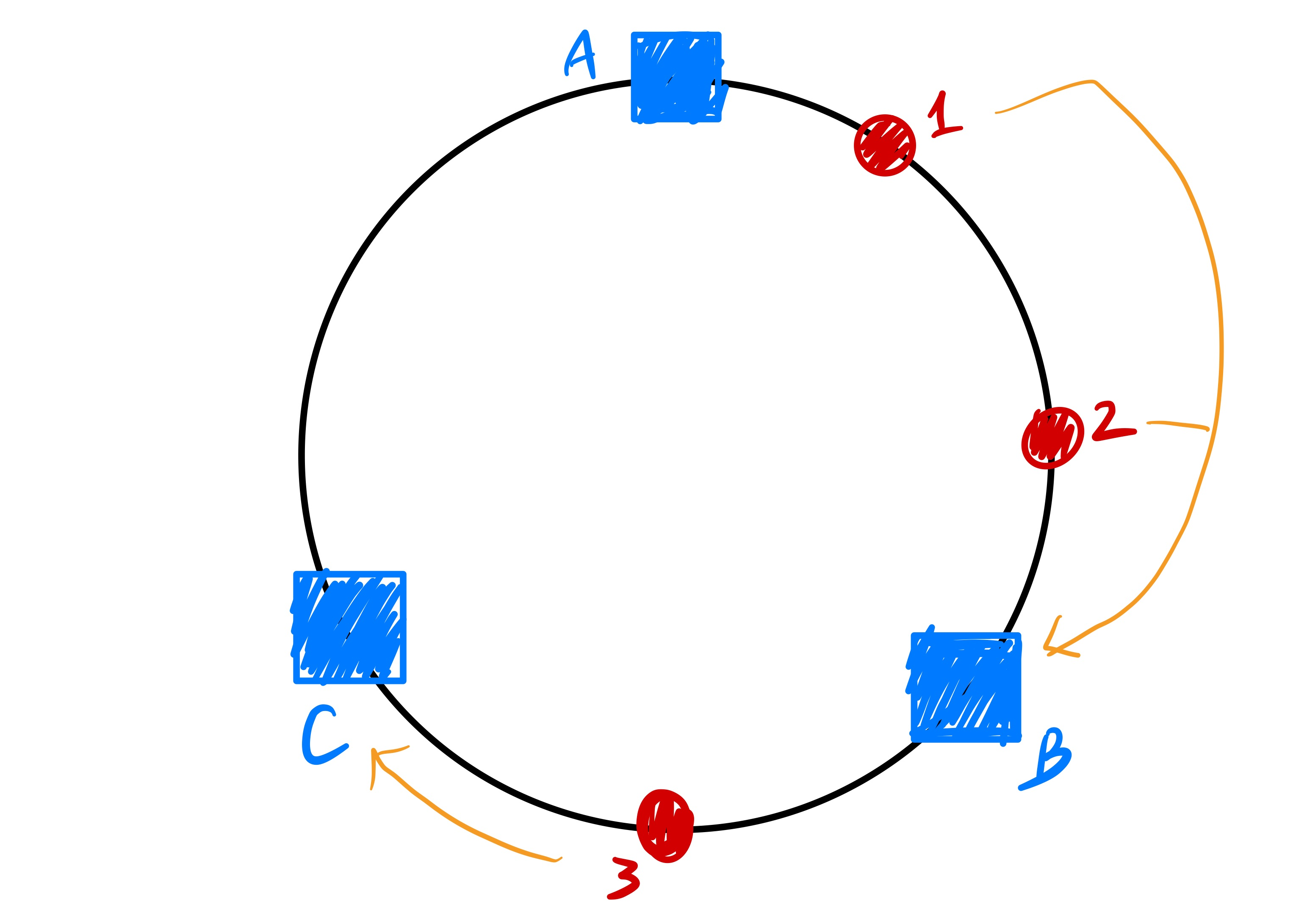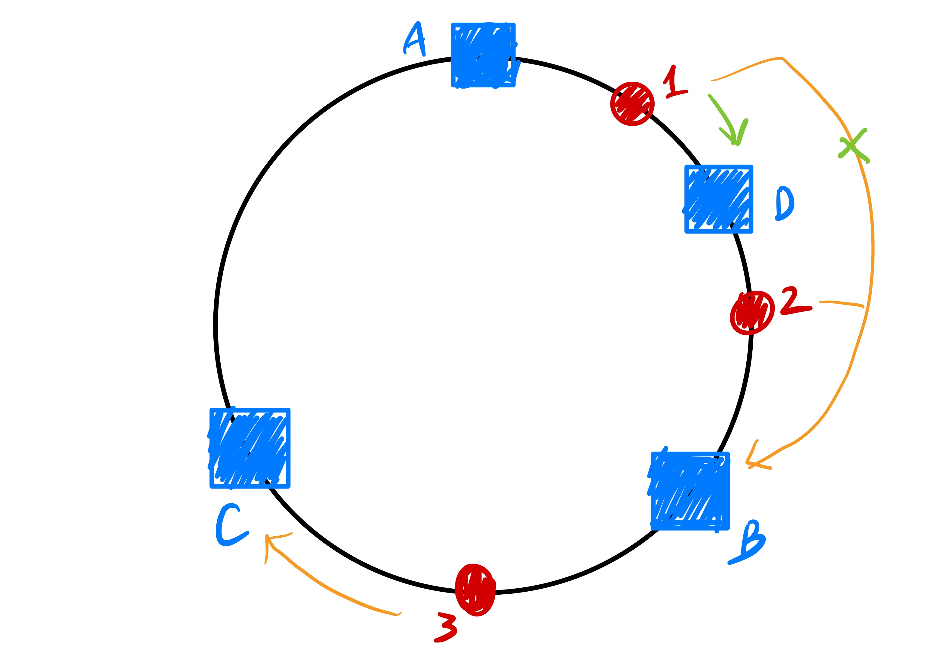 - 키의 위치에서 링을 시계 방향으로 탐색하다 만나는 최초의 서버가 키가 저장될 서버