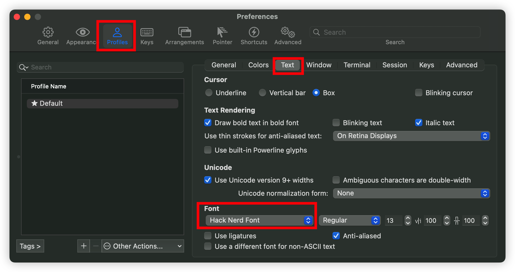 command + , > Profiles > Text > Font 설정