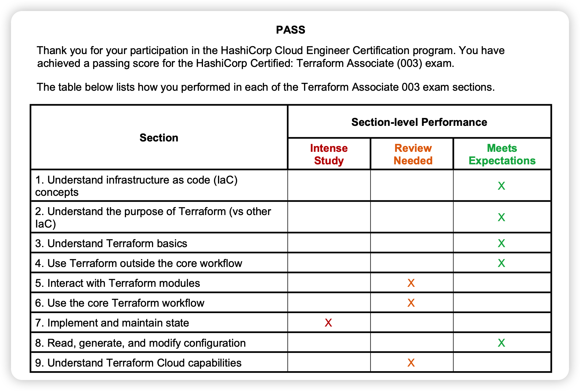 문제를 꼬아서 내는 AWS나, 실습형인 k8s 자격증들과 달리 테라폼/IaC에 대한 기본 지식만 있으면 되는 것으로 기억하고 있어서, 정말 후기 찾아보기, 공부하기, 강의듣기 등등,,,, 아무것도 안하고 바로 시험 쳤다. (심지어 시험치기 직전까지 일 함 ㅋㅋ)