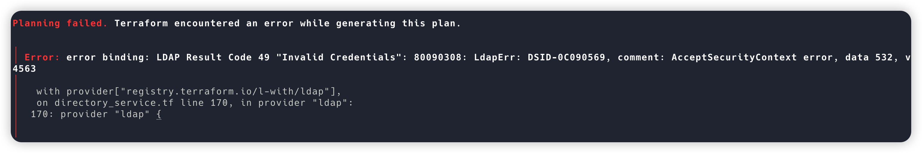 Error: error binding: LDAP Result Code 49 "Invalid Credentials": 80090308: LdapErr: DSID-0C090569, comment: AcceptSecurityContext error, data 532, v4563