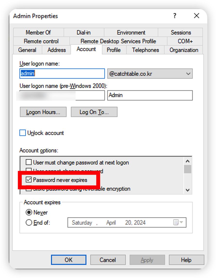 이제 접속이 되므로 Controller 서버에 접속해, Admin 유저 속성 > Account 에서 Password never expires 를 체크해줬다.