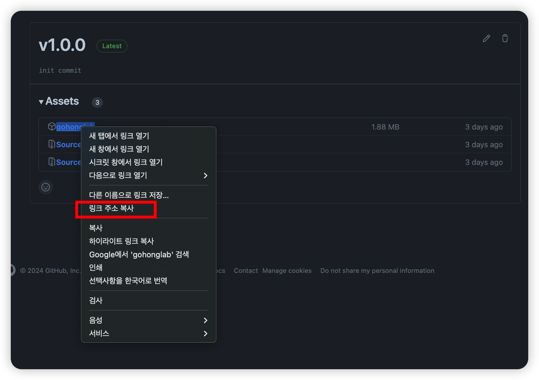 release를 만들면 Assets에 빌드파일이 올라가 있다. 마우스 우클릭으로 링크 주소를 복사해두자.