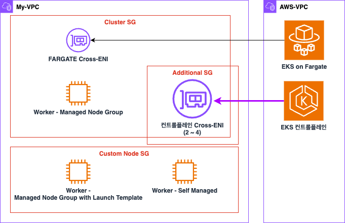 - 컨트롤플레인의 cross-eni : 클러스터 보안그룹 & 추가 보안그룹 사용