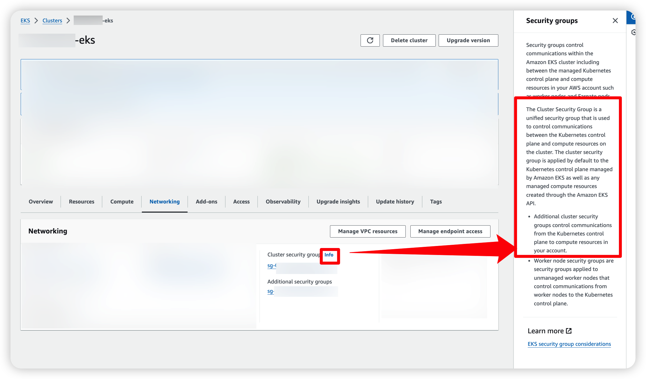 eks console > Networking > Cluster security gruop Info 를 눌러보면 설명이 나온다.
