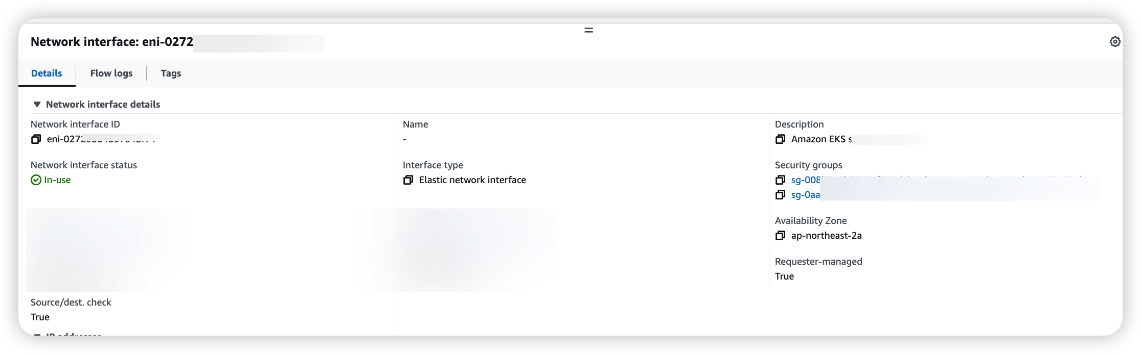 네트워크 인터페이스 콘솔에서 "Amazon EKS <cluster name>" 이 description인 놈들을 찾으면 된다.