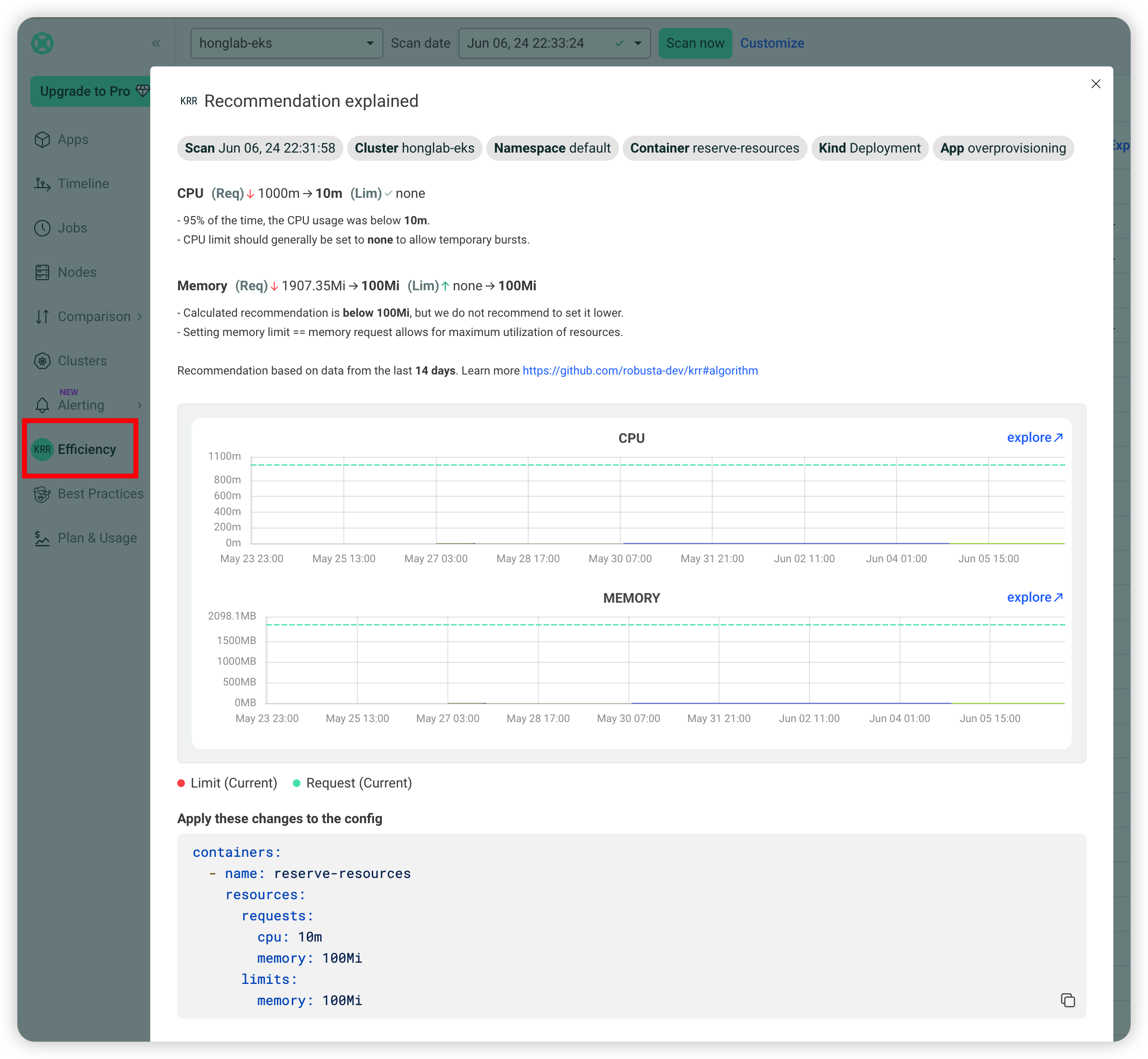 Efficiency 탭에서는 파드의 권장 리소스를 제안해준다. (개미쳤다)