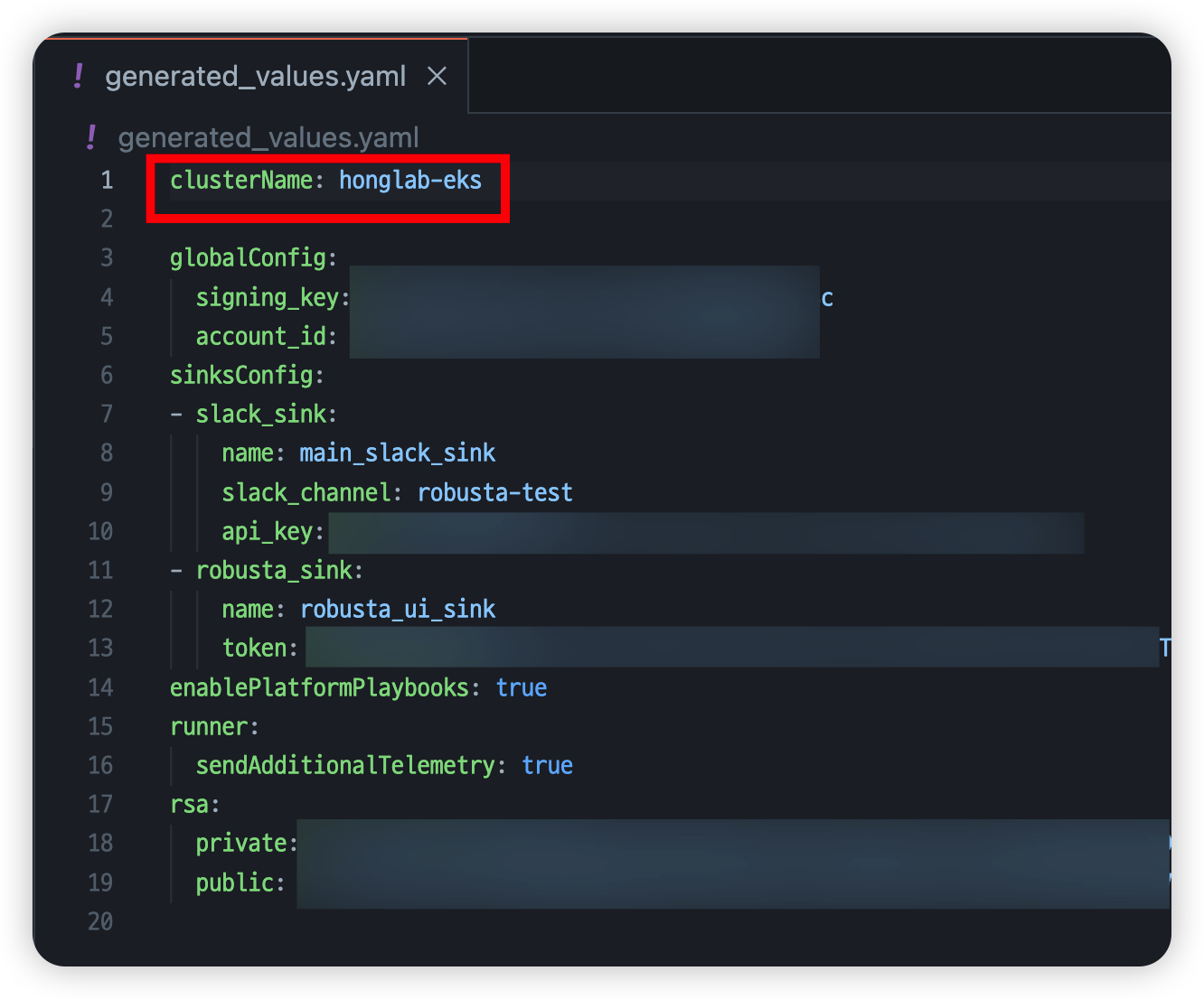 이 파일에 `clusterName`만 추가하면 설치준비는 끝난다. (robusta UI에서 구분되는 클러스터 이름이다.)