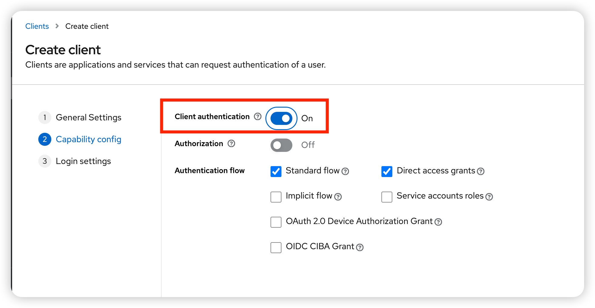 Client Secret이 필요하므로 Client authentication을 활성화시킨다.