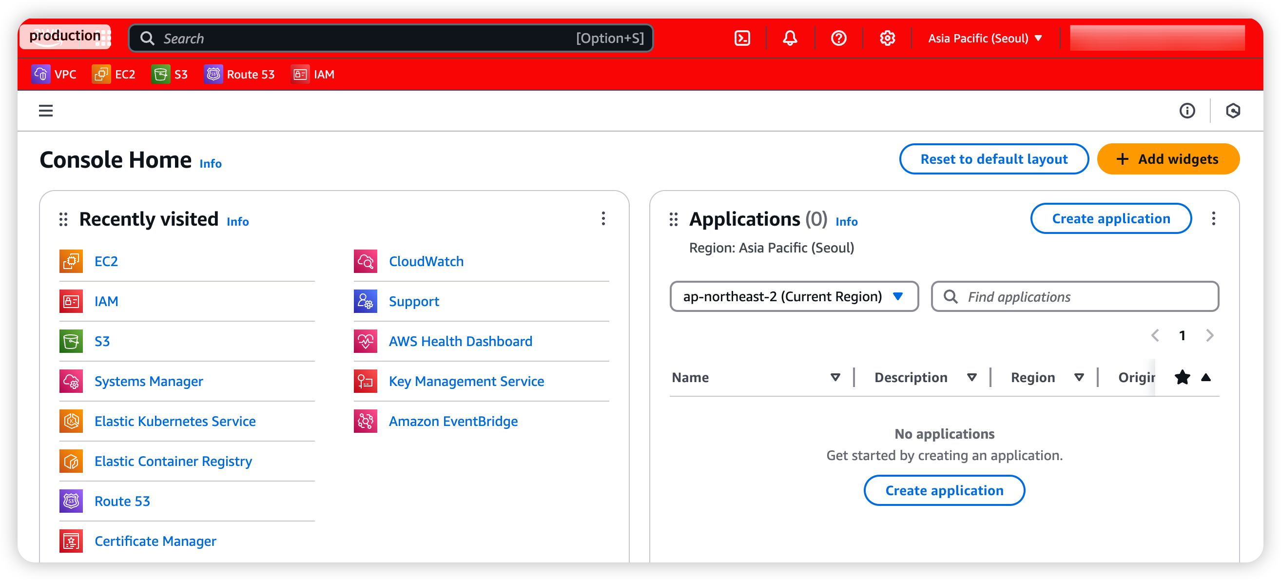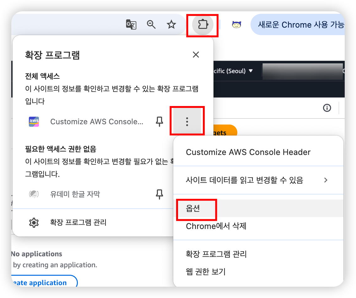 다만 내 실수도 충분히 늘어날 수 있기에... 계정별 AWS 콘솔 상단 색을 변경해주는 크롬 익스텐션을 찾아 설정해 보았다.