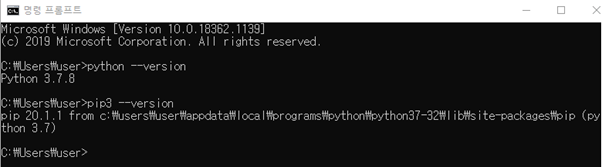 잘 설치되었는지 확인하기 위해 cmd에서 python과 pip버전을 확인