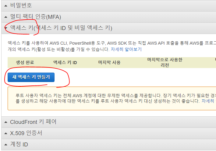 액세스 키 >> 새 액세스 키 만들기