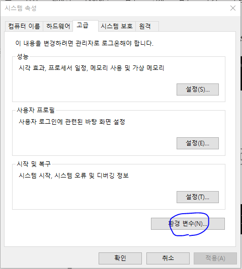시스템 환경 변수 편집 >> 환경 변수