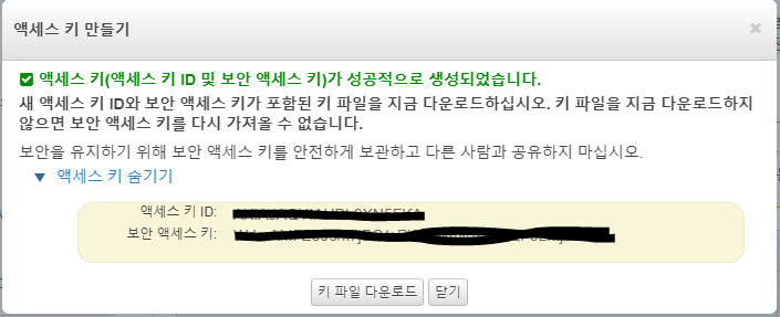 액세스 키 표시 >> 액세스 키와 보안 액세스 키를 어딘가에 복사해두자(키 파일을 다운받아도 ㄱㅊ)