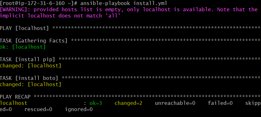 첫번째 task는 yum으로 python-pip과 python3-pip을 가장 최신 버전으로 설치하는 것이고, 두번째 task는 pip으로 boto와 boto3를 설치하는 것이다