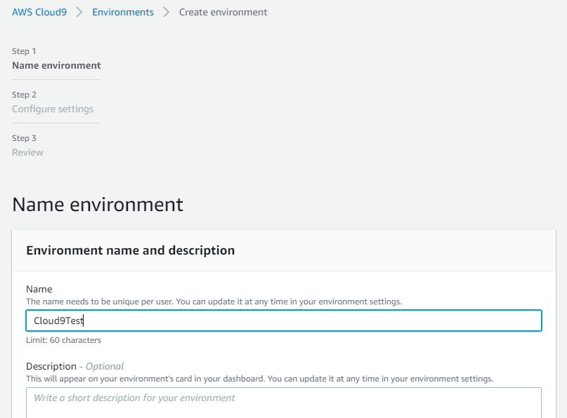 aws console에서 서비스 > cloud9 > Create environment 를 누른다