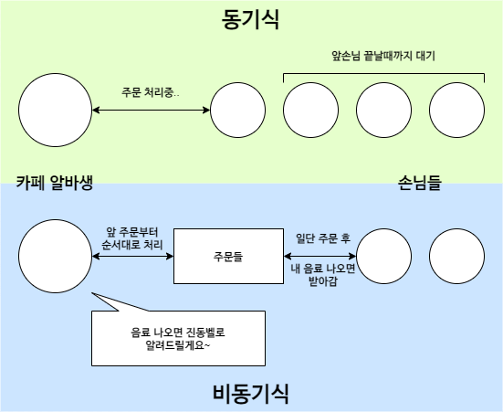 동기식은 한 번에 한 주문씩 처리하고, 비동기식은 주문을 다 받아놓은 후 차례대로 처리한다