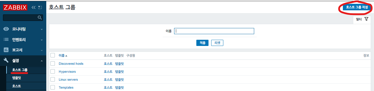 설정 > 호스트 그룹 으로 들어가서 맨 오른쪽 상단의 호스트 그룹 작성을 누른다