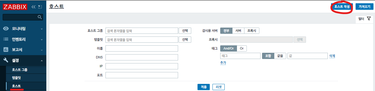 설정 > 호스트 로 들어가 마찬가지로 오른쪽 상단에 있는 호스트 작성을 눌러준다