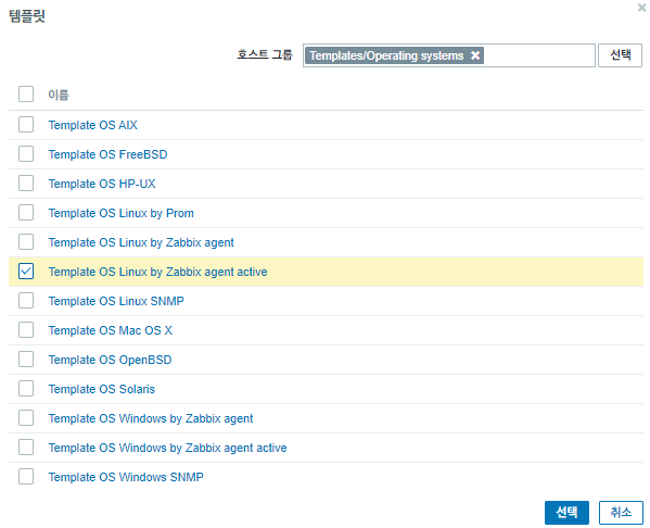 Active 방식의 Linux Agent 템플릿을 선택해준 후, 추가를 누르면 등록이 끝난다