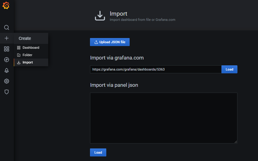 그러고 grafana로 돌아와 + > Import 를 눌러 복사한 url을 넣고 load해준다