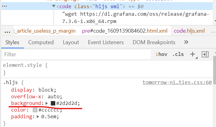 검사로 code 태그의 배경색을 확인하고, pre 태그의 배경색을 동일하게 바꿔주었다