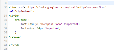 link와 style 부분의 Overpass Mono 부분을 본인이 고른 폰트로 바꿔주고 </head> 위에 써주면 된다
